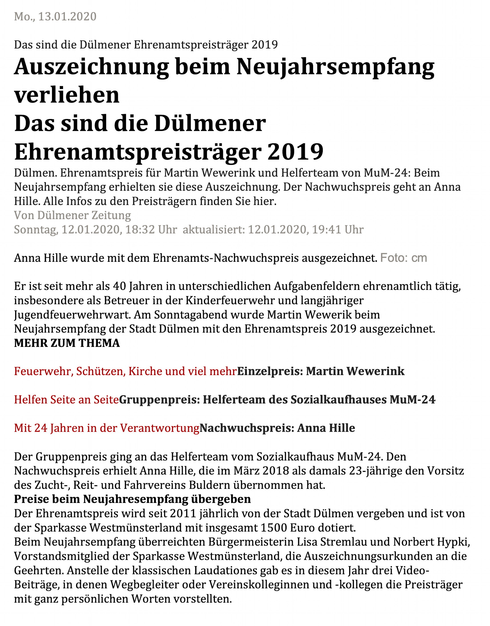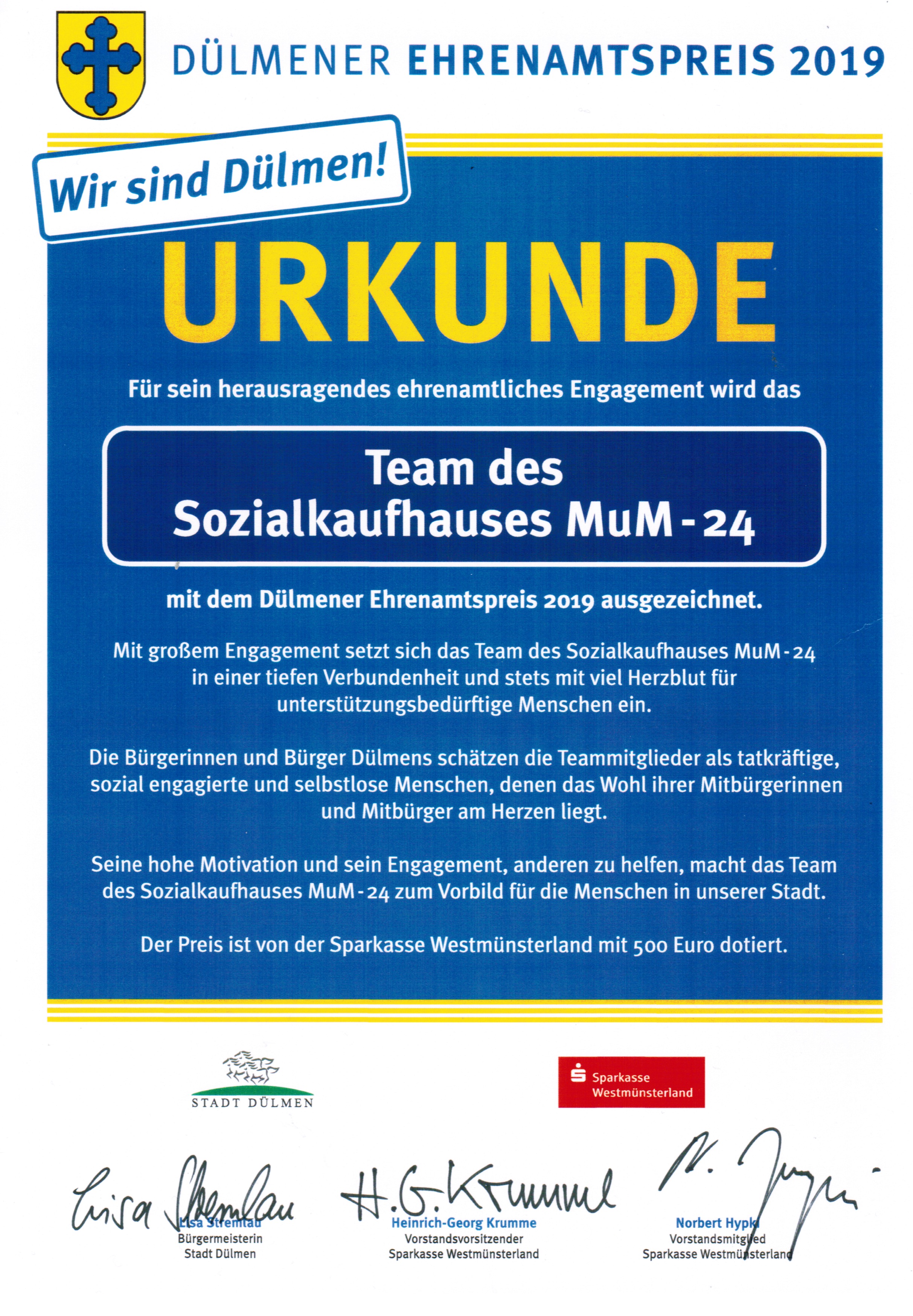 Ehrenamtspreis der Stadt Dülmen 2019 für MuM-24 verliehen