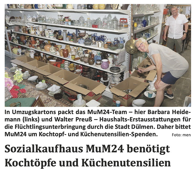 Das MuM-Sozialkaufhaus benötigt dringend Spenden (Haushaltsware) 26 Jan 2025 Von H.Klausdeinken Weiterlesen … Das MuM-Sozialkaufhaus benötigt dringend Spenden (Haushaltsware)
